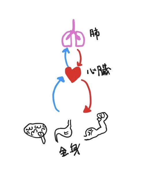 心臓から送り出された血液は 動脈→毛細血管→静脈を通って戻り、 また肺で酸素を取り込んで…の繰り返し。